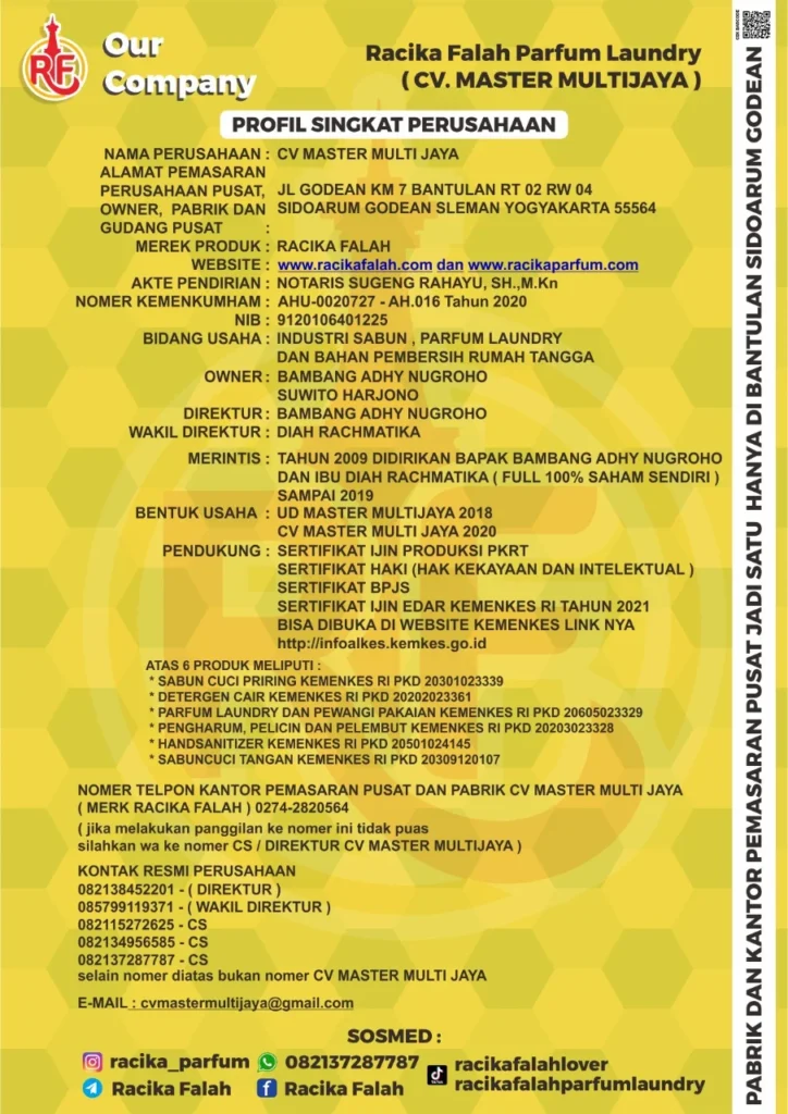 Racika Falah merupakan perusahaan produsen produk-produk bahan dan kebutuhan Laundry. Sudah memiliki izin dan legalitas yang lengkap.